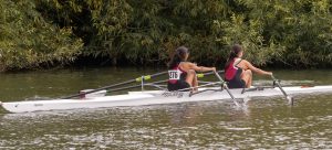 Also in the morning, the multiple Women’s doubles crews, including three pairs of sisters made up of J16 & J17s! First up were sisters Lily and Poppy Warren, who started off strong and persevered through a tough race but unfortunately lost out to their opposition. Up next were sisters Poppy and Martha Baines: in a well executed race, the pair had a strong finish but ultimately fell short against strong opposition from Exeter. Also racing in the W2x event was J17 athlete Sophie Evans and her coach Imogen North. They raced against Exeter successfully in their first race and went on to win against another Stratford double in their semi-final. This resulted in a close race against another Exeter crew in the final where they took the win for the event.