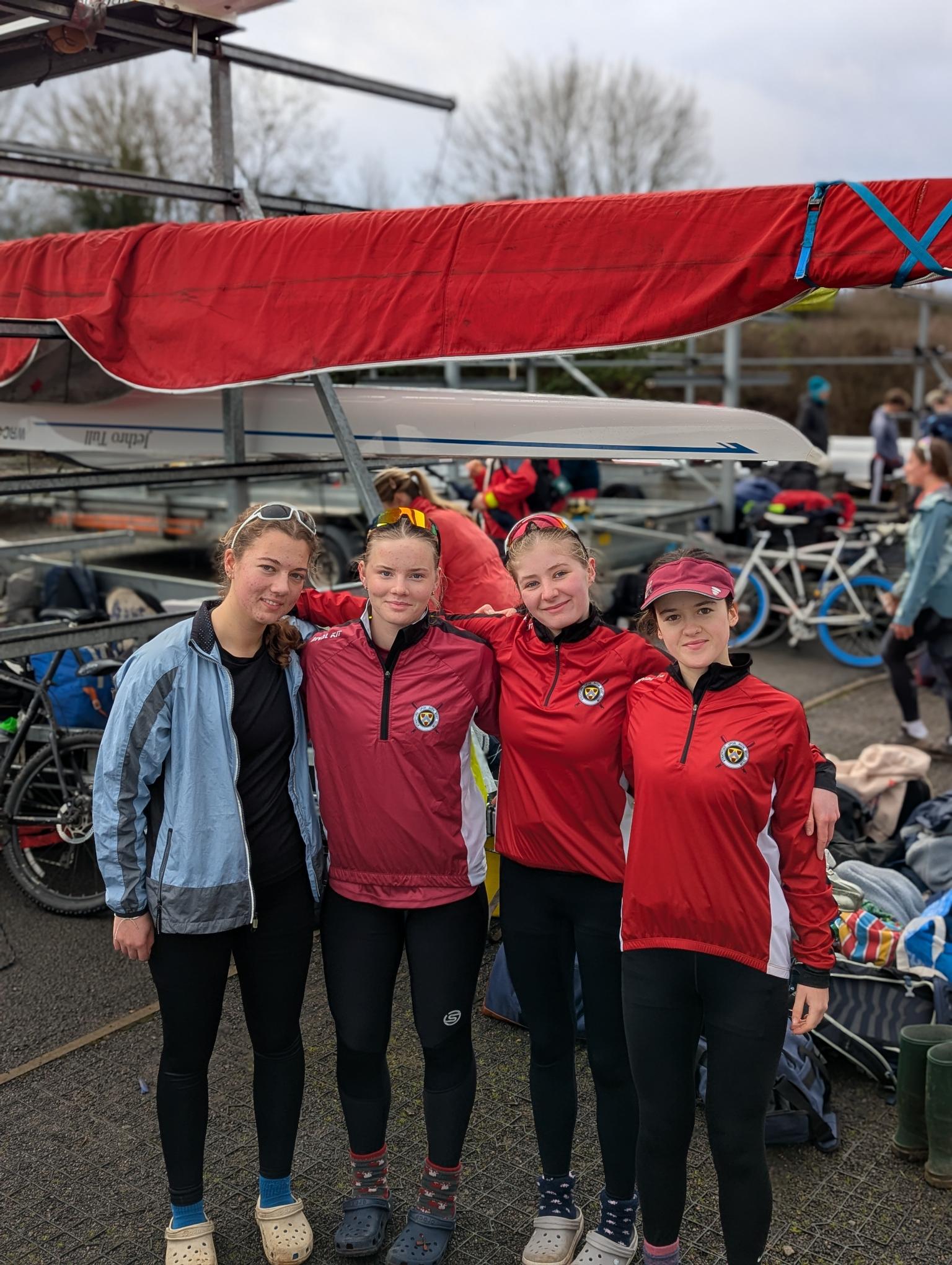 the crew behind them to finish fifth out of a field of eleven strong competition in a time of 18:22. The J15 girls Abi Dunn, Meredith Paul, Lilly Parsons and Scarlett Wheeler with cox Raya Hothi followed shortly after and maintained good discipline and technique throughout the race, to finish in eleventh out of a field of fifteen in a time of 21:42 seconds