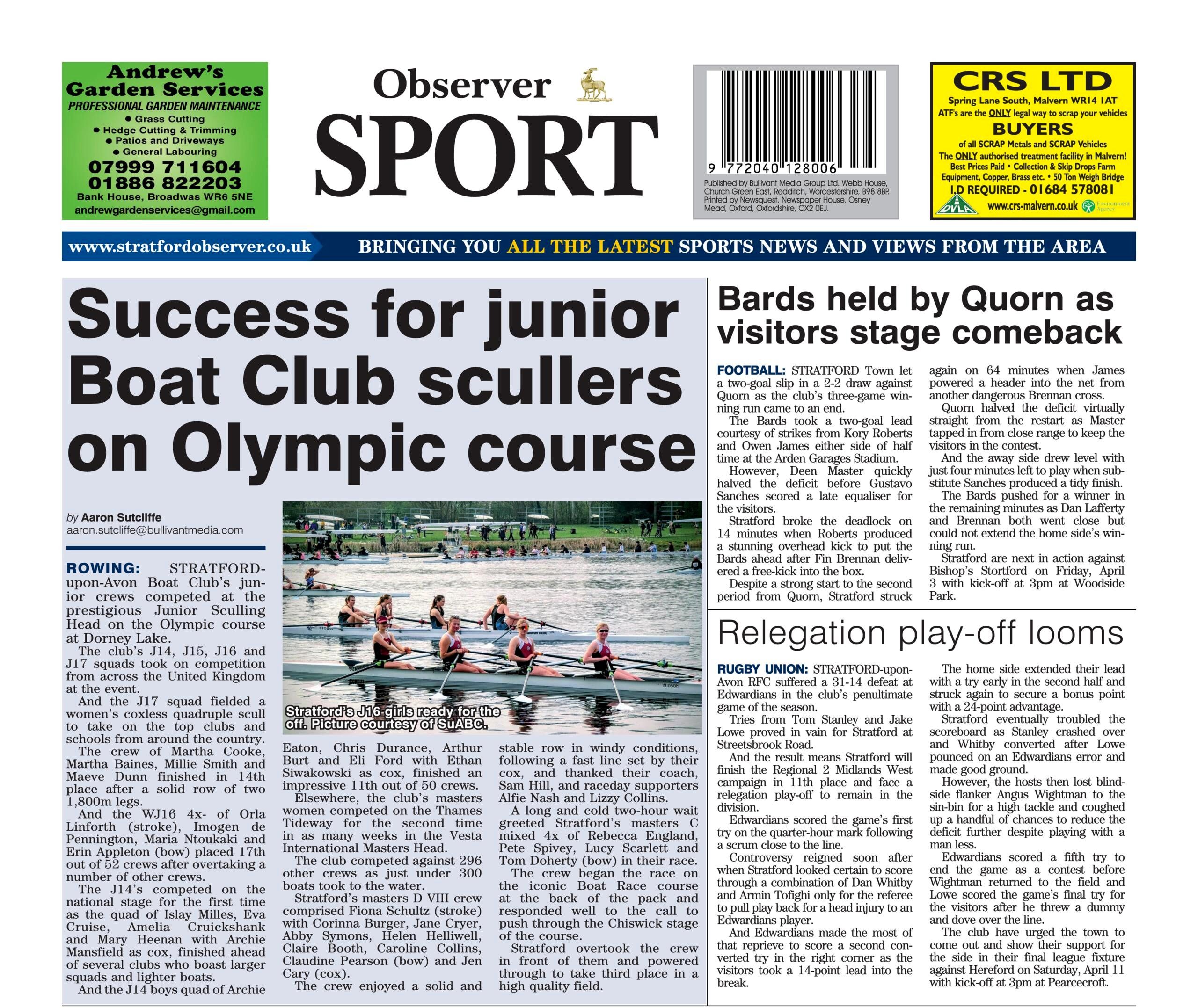 For media coverage, see Stratford Observer online https://stratfordobserver.co.uk/sport/rowing-stratford-boat-clubs-young-scullers-show-olympic-potential-at-junior-sculling-head and back sports page https://stratfordobserver.co.uk/editions/view/?/Stratford/2026/04/03&pages=24: also see Stratford Herald online https://www.stratford-herald.com/sport/high-profile-test-for-stratford-boat-club-s-junior-crews-9460248 and page thirty nine. For more pictures of Scullery, see Stuart Baines’ great selection https://onedrive.live.com/?redeem=aHR0cHM6Ly8xZHJ2Lm1zL2YvYy8zZGQ4ZjZhNzBjMGNiNjI1L0lnRE1qUHoyN3BLYlRKQXp5ZDhMWVQtbUFZTDhnYl9sZ1ViSzJScW5tZ1FfSVBrP2U9TlNoRzB4&id=3DD8F6A70C0CB625%21sf6fc8ccc92ee4c9b9033c9df0b613fa6&cid=3DD8F6A70C0CB625