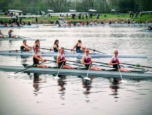 seventeenth out of fifty two crews rowing on the day, with their first 1800m completed in 6:59.9 and their second 1800m in 7:15.7, making a total time of 14:15.6. Stroking at twenty eight/thirty strokes per minute, the girls overtook a number of other crews, thereby earning another minute of catching their breath at the