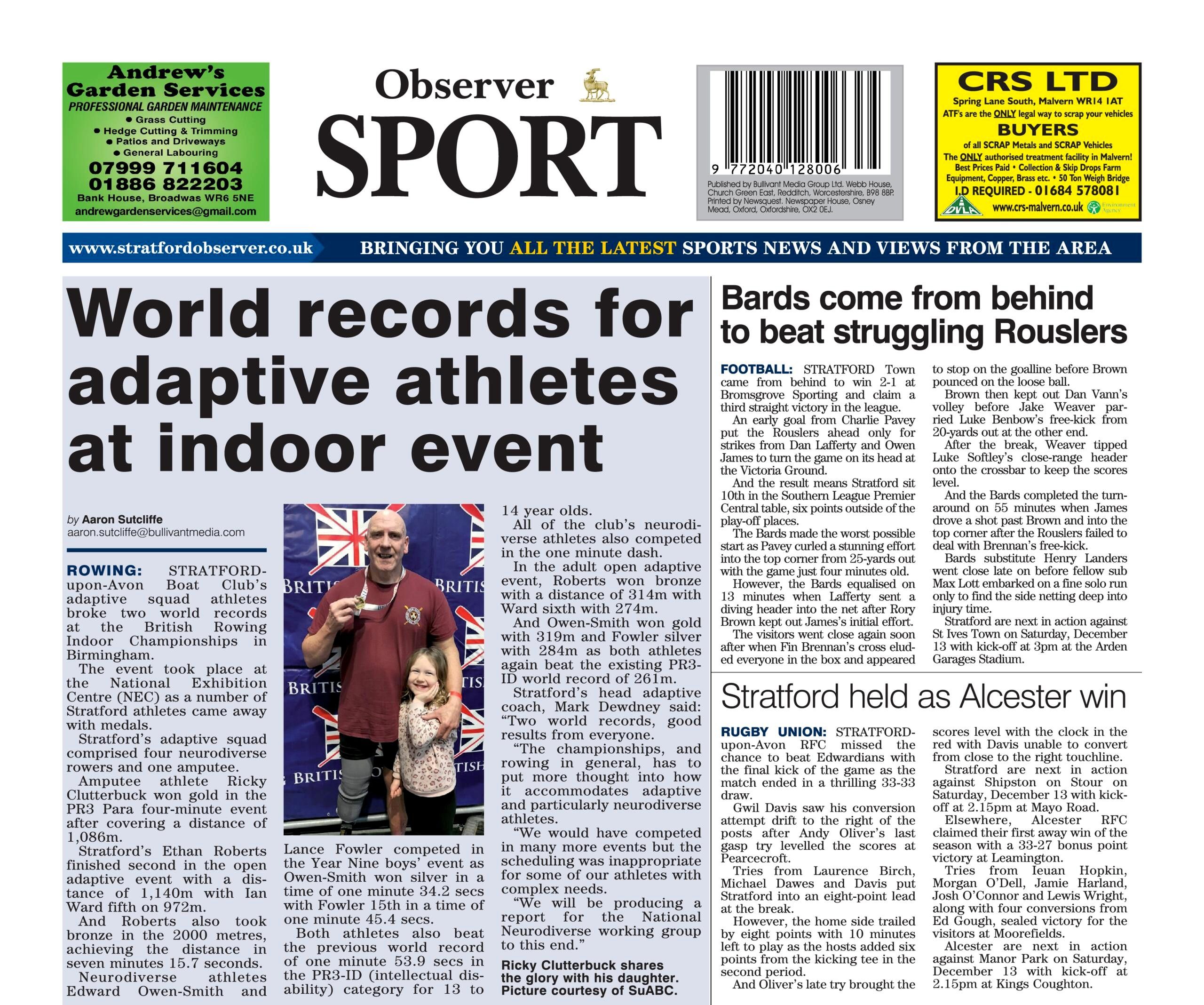 For media coverage, see Stratford Herald online  https://www.stratford-herald.com/sport/stratford-rowers-claim-two-world-records-at-british-indoor-c-9444995 and page thirty seven, British Rowing https://www.britishrowing.org/2025/12/the-numbers-behind-the-british-rowing-indoor-championships-2025 and Stratford Observer back sports page https://stratfordobserver.co.uk/editions/view/?/Stratford/2025/12/12&pages=24, online https://stratfordobserver.co.uk/sport/rowing-stratford-boat-clubs-adaptive-squad-break-world-records-at-british-rowing-indoor-championships and Concept online https://www.concept2.com/records?record_type=world&machine=rower&event=&gender=&age_category=13&srsltid=AfmBOoqXAOLOOWcgQ0ZjSWbBBp47rZM5KL5utP1KDx7IZBEVfMZBe5Av&adaptive_rower=3&language_variant=