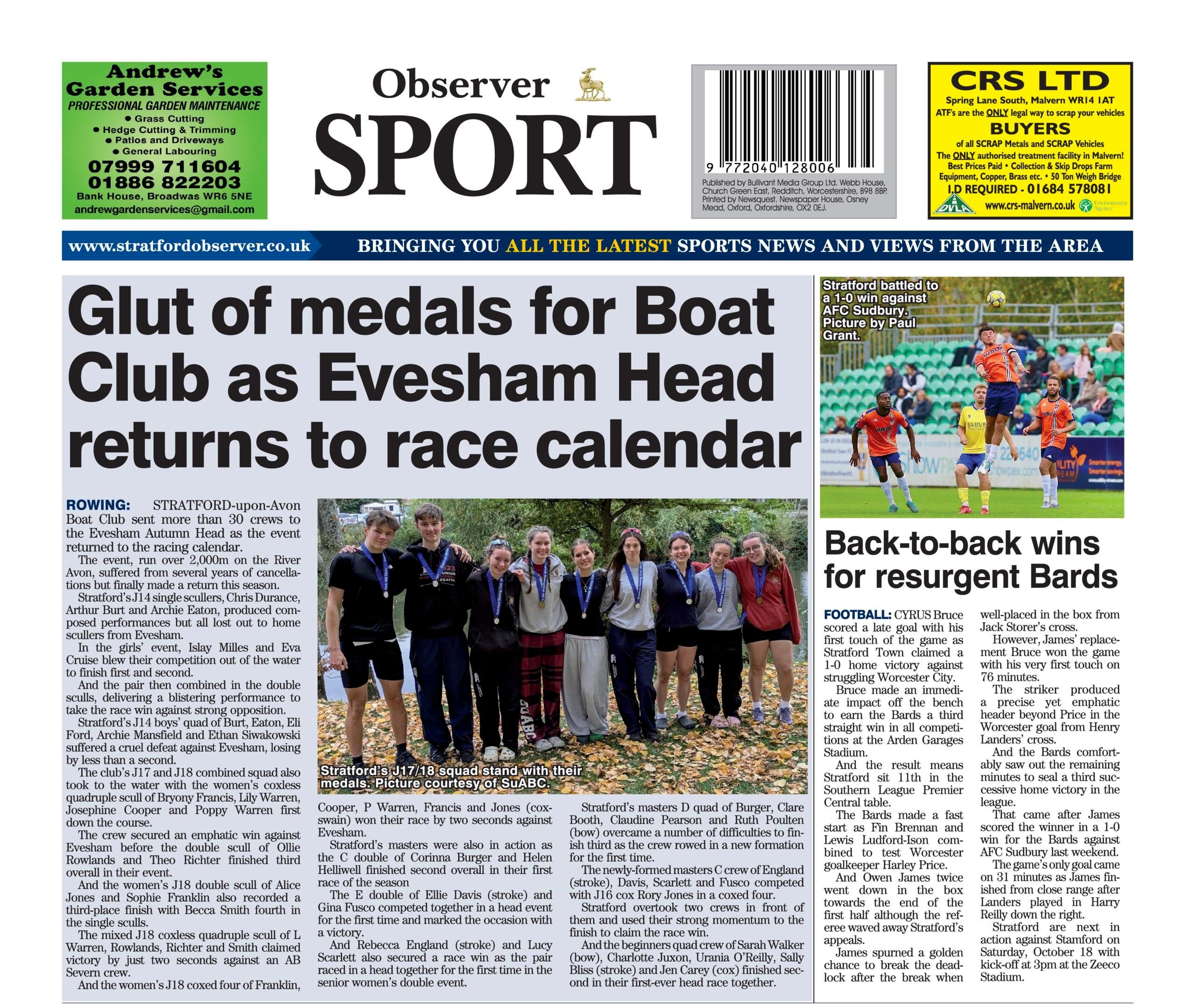 For media coverage, see Stratford Herald page sixty three and online https://www.stratford-herald.com/sport/stratford-rowers-are-out-in-force-at-evesham-event-9437519 and also Stratford Observer online https://www.stratfordobserver.co.uk/sport/rowing-stratford-boat-club-win-medals-galore-at-evesham-autumn-head and also back sports page https://stratfordobserver.co.uk/editions/view/?/Stratford/2025/10/17&pages=24