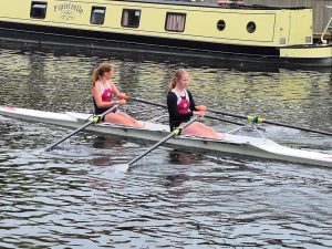 Stratford’s J15 squad fielded a large entry at Evesham, with ten boats in total across all three divisions and with many of the athletes rowing the 2km course twice. First up in the lovely flat conditions were the doubles, with all three girls’ crews finishing a few seconds apart in fifth (Martina Bruce/Bethany Hammond), sixth (Abi Dunn/Meredith Paul) and seventh (Lillian Parsons/Scarlett Wheeler). In the