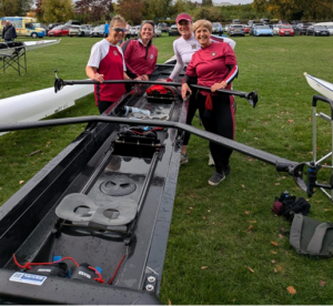 In the last Division Three of the day Women’s Masters had three crews entered. Corinna Burger, Clare Booth, Claudine Pearson and Ruth Poulten (bow) in the Women’s Masters D quad. Their boat, Imperious Countess first outing with new riggers and a new crew formation. In the water, the first stroke appeared to demonstrate a complete inability to row but captain Ruth Poulten (bow) navigated “gate-gate” with calm and confidence and thanks to on-land support and a spanner, gates and oars adjusted, once again the crew were mobile. Ruth steered the course superbly for a respectable timed result. Handicaps placed Stratford third behind two home crews. Ruth Poulten said, “Crew camaraderie, team focus and determination ensured we overcame a number of obstacles on the day to complete the 2k race with smiles all round.”