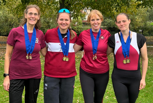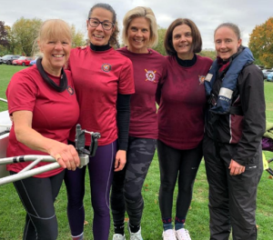 Last up of the day for Women’s Masters was the beginners quad crew of Sarah Walker (bow), Charlotte Juxon (2), Urania O’Reilly (3), Sally Bliss (stroke) and Jen Carey (cox). They came over the line in great form to finish second of three in their first ever head race together. They kept a steady rate from the start with a final push to secure their position. the crew were super proud of what they achieved.